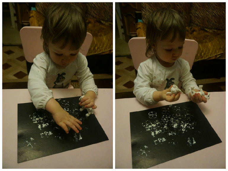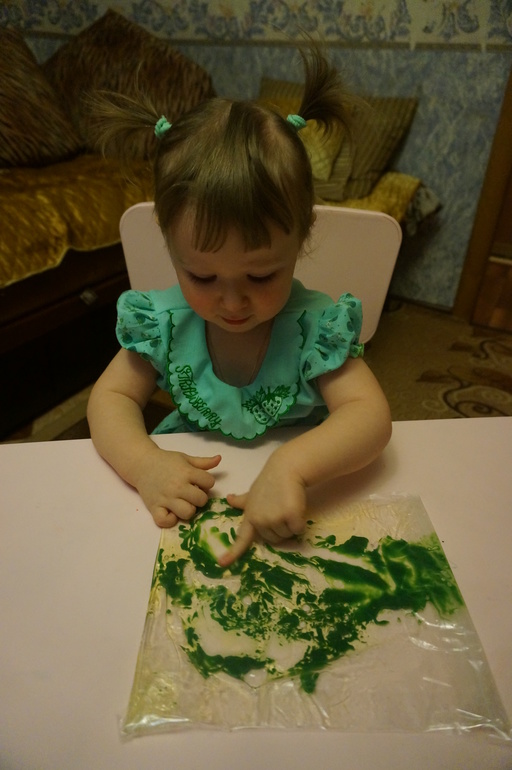 - и в завершении перед дневным сном, мы поиграли "в новую игру" (так ее София назвала) - пакет с краской. Очень понравилась идея. Обязательно повторю ее с несколькими цветами: