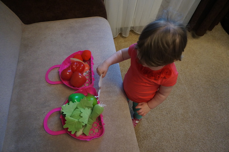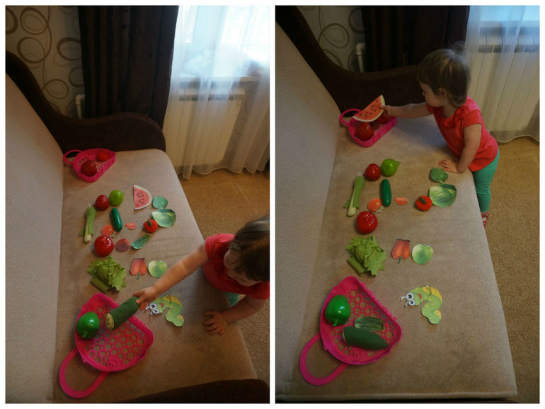 Далее мы отправились кормить гусеницу фруктами и овощами, а точнее спасать их от гусеницы. Я предложила Софии разложить по корзинкам: красные в одну, зеленую в другую. Тут Сонька чуток запуталась, но больше из-за скорости игры, а не из-за незнания вопроса: