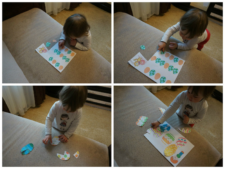 Пока мы с Соней рассматривали картинки с яйцами, бабушкин кот разыгрался! Перепутал все ряды с яйцами. Я попросила Софию восстановить последовательность. Это оказалось не просто( буду уделять этому больше внимания. София была уверена, что надо играть, как в "лото" и начала раскладывать яички по цветам. и только после моих подсказок - что-то дельное у нас вышло.