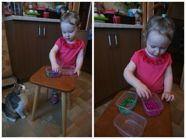 Потом я предложила дочурке рассортировать бусинки, которые мы вылили в один общий дуршлаг из банок: