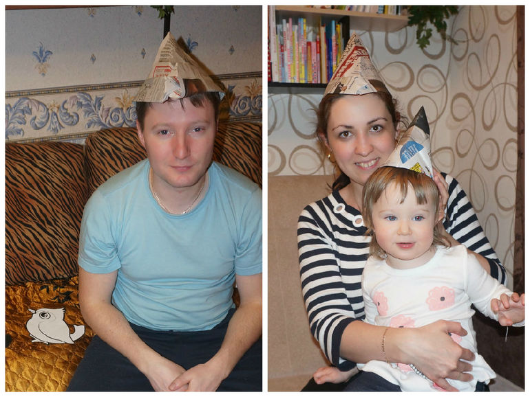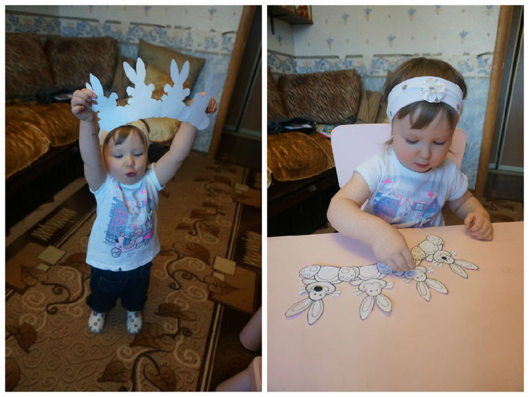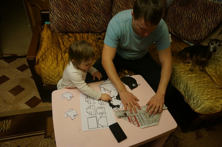 Потом папа изготовил для нас всех шапочки. София активно ему помогала и рассказывала про своих птичек. Они произвели особое впечатление на нее: