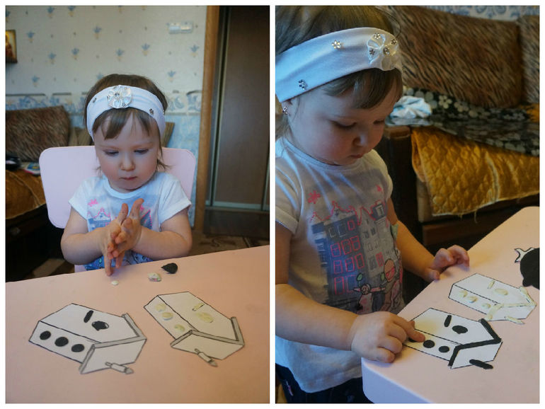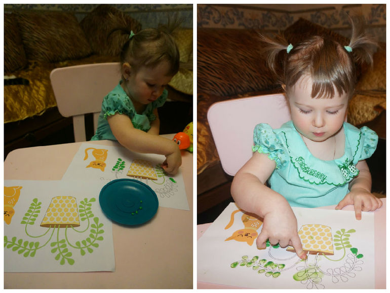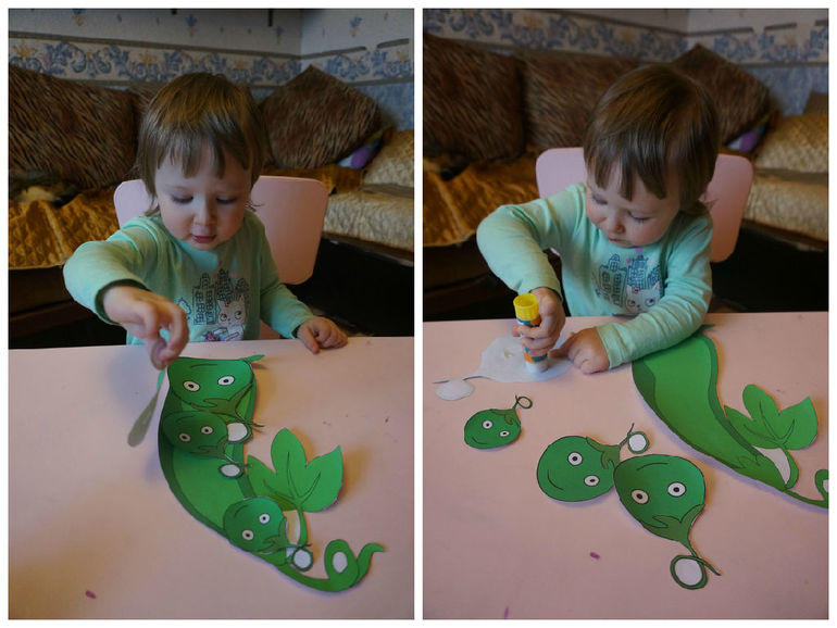-сели опять за стол и разложили горошинки в стручок. Выяснилось,что там есть мама, папа и малыши) потом мы их приклеили, чтобы они не разбегались больше: