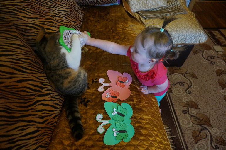 Прибежав в комнату София обнаружила бабочек на диване и сачок, но ловить их не стала. Жертвою сачка стала наша кошка) а бабочек мы просто разложили по цветам: