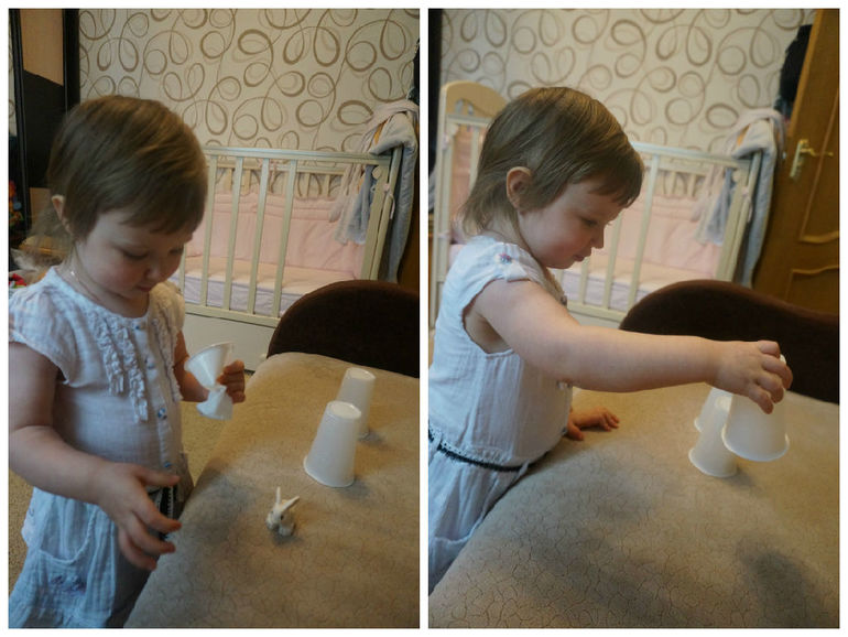 А еще мы со стаканчиками поиграли в "прятки". Я прятала зайчика под стаканчиком, а София искала его. И на удивление в 80% находила с первого раза: