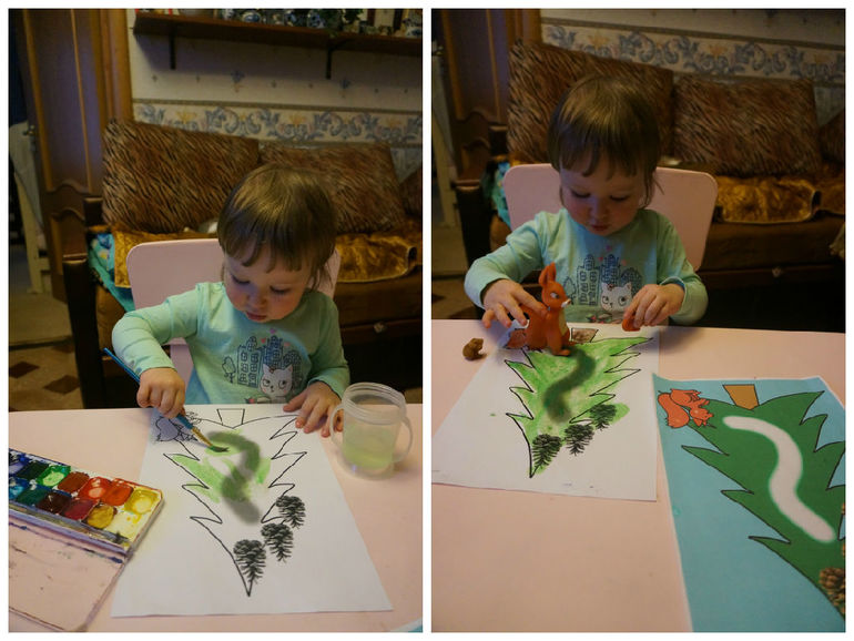 Далее моя дочурка запросила краску, кисточку и "картинку". Видимо настолько уже привыкла, что я ей выдаю какую-нибудь заготовку. Пришлось дать ей елочку из другого дня,т.к. я планировала дать горошины красить вечером. У нас вышло ни чуть не хуже оригинала: