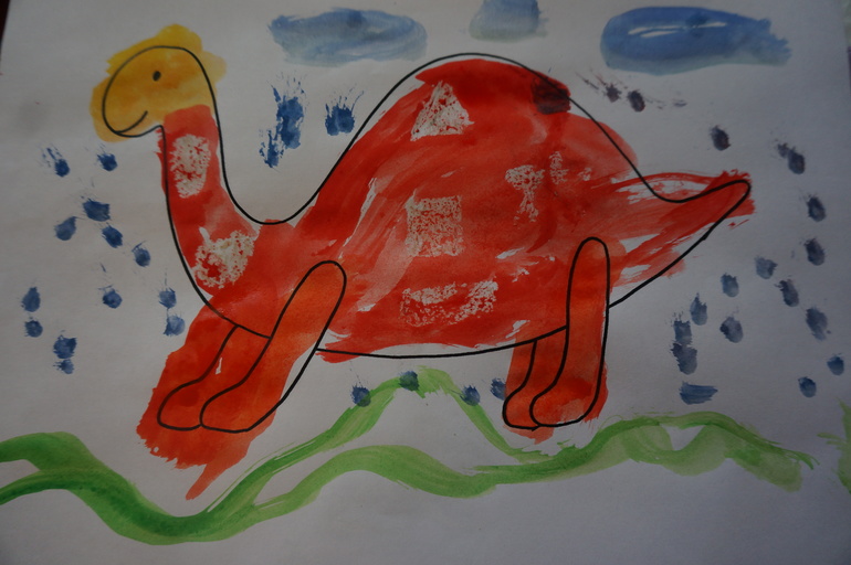 - закрасили фломастером ромбики у рыбки и на спине динозаврика;