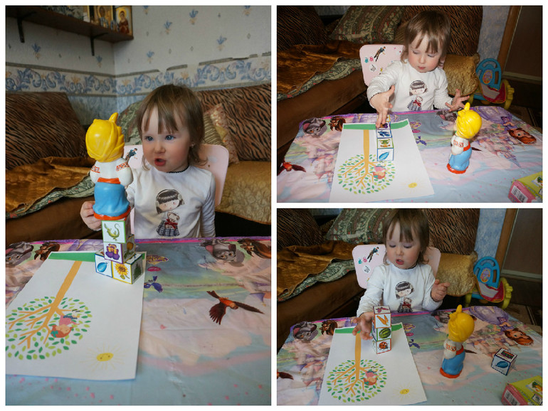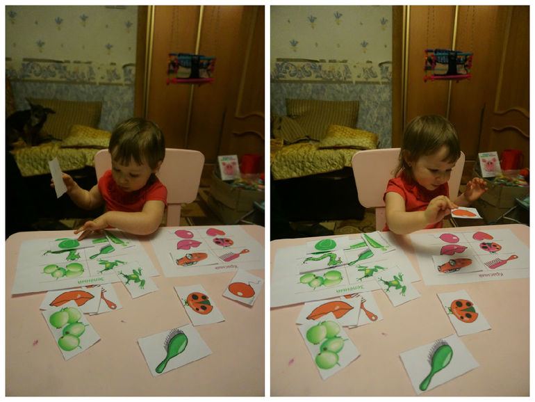 Утро мы начали с игры в лото) дабы родители могли позавтракать спокойно) Сонечка настолько его полюби, что не просто раскладывает карточки по своим местам, но и комментирует все свои действия, рассказывает что нарисовано и т.д.: