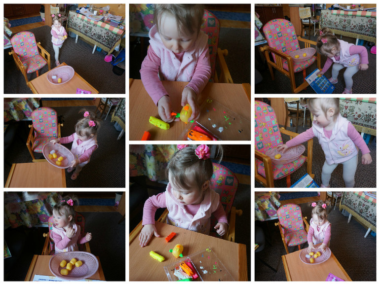 Далее, как и полагается, был завтрак. Цыплятки кушают зернышки. Я дала Софии ватную палочку и она нарисовала зернышки всем цыпляткам.