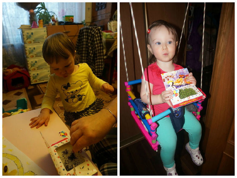 После сна мы катались на качелях, т.к. не ходим на улицу (чуток простыли). И вспомнили о нашей травке, которую мы посадили в начале проекта. Она уже выросла: