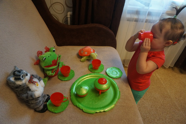 Дальше мы устроили чаепитие с зелено-красными игрушками и зелено-красной посудой. По случайному совпадению у меня был припрятан набор посуды для кухни зеленого-красного цвета. изначально планировала подарить его дочурке летом на 2 годика вместе с кухней, но раз уж тут такое дело, то пришлось достать его раньше: