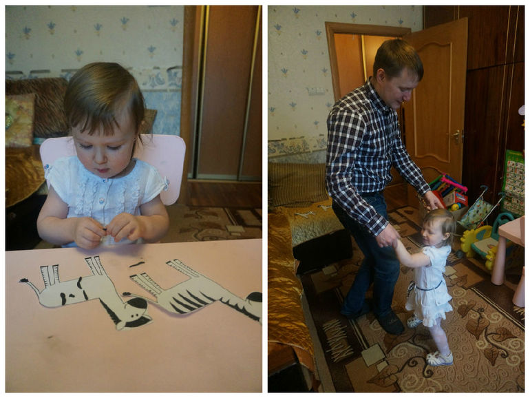 Далее мы приклеивали зебре полосочки и танцевали под песенку Железновой "А у зебры есть полосочки", к танцам присоединился и папа: