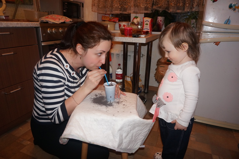 После садика мы продолжили игры. К нам присоединился папа. Мы сделали "фокус" с черной водой. София отнеслась к нему очень настороженно: