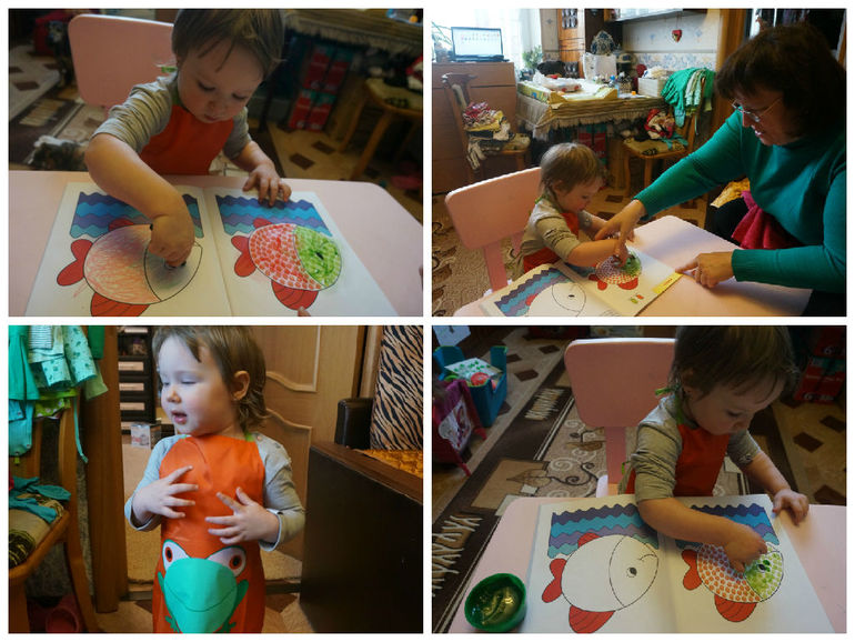 Потом переместились за стол и стали творить: рисовали, играли с пуговичками.