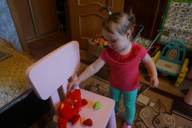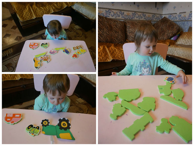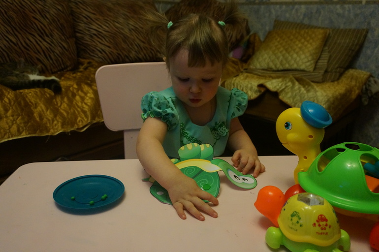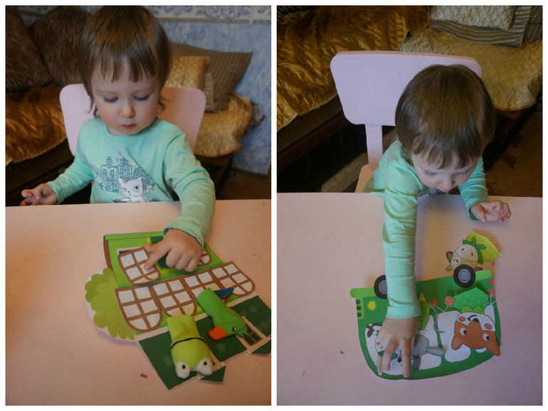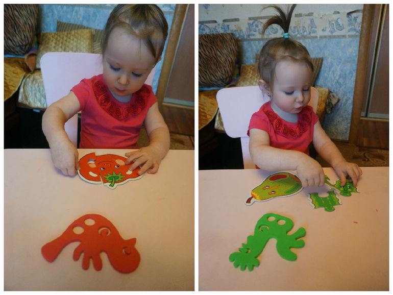 В гости к нам пришел динозавр (которого мы забыли в Москве), он то и провел все игры с Софией. Много было сортировки: и по цветам и по размерам. лото мы полюбили с проекта "Цветик-шестицветик для годовасика", поэтому играли в него несколько раз за день. А вот "пазл" из палочек нам давался с трудом: София никак не могла сообразить, что палочки можно переворачивать)