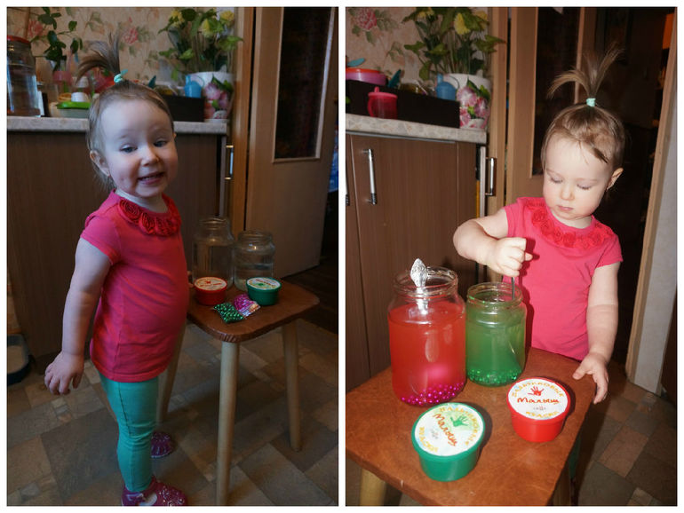 Далее мы отправились на кухню, красить воду. Дочка сказала,что это фокус. Мы высыпали в баночки бусины, соответствующих цветов, а потом добавили краски и дочка размешивала. Эмоций было много и в ходе подготовки к "фокусу" и в процессе его выполнения: