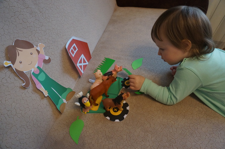 - поиграли в ферму. Кормить зверюшек Сонька не стала, зато покатала их тракторе: