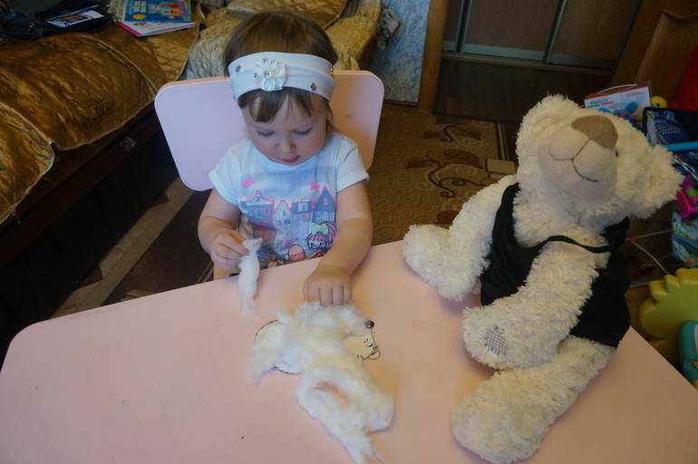Дальше мы укрывали малюточку мишутку одеялом (ватой). а мама Мишка-пела нам песенку: