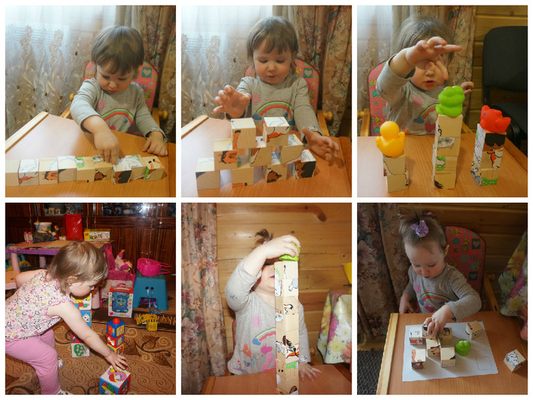 Строили башенки из различных предметов, а потом с огромным удовольствием ломали их. Катали и кидали мячик и кубик (чуть не разбили бабушкину посуду), что самое интересное несмотря на все законы физики: наш кубик катался с горки ничуть не хуже круглого мячика.