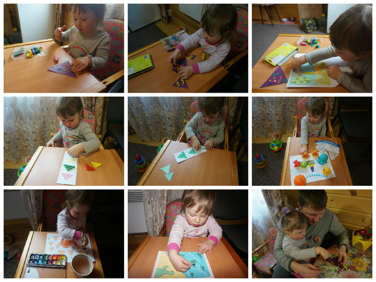 По аналогии с кругом, день мы начали со знакомства с фигурой, ее украшением: сделали несколько треугольников с разными выражениями лиц. Дальше помогли динозаврику позавтракать листочками, сделали ему длииииную шею. Потом играли в различную сортировку по цветам и размерам. Уж очень это занятие нравится Софии. Сдували бумажные фигурки с листа, тем самым делали дыхательную гимнастику.