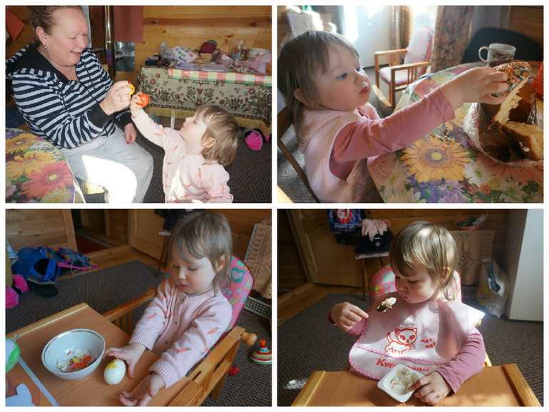Пасхальное утро, по традиции, мы начали с поедания яиц, кулича и пасхального творога. София чокалась яичками со всеми) хохотала)