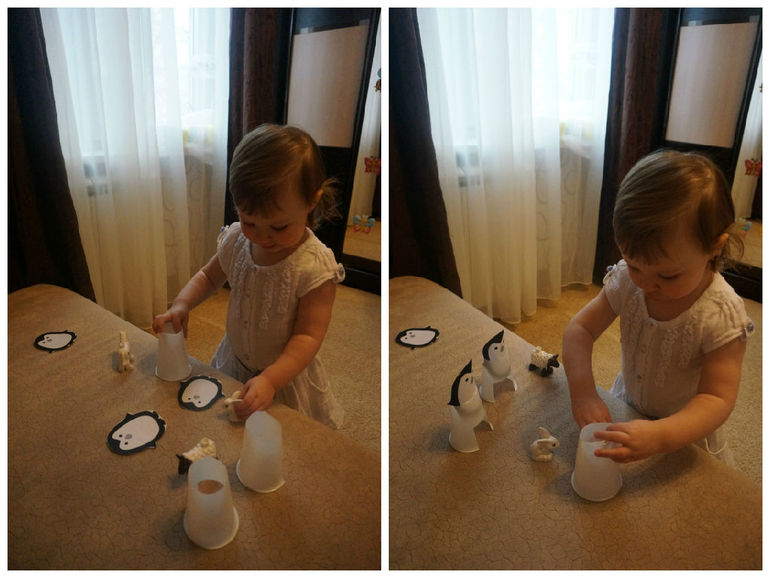 Далее мы отправились играть с пингвинами, но они оказались больше стаканчиков) поэтому в стаканчики-домики заходили другие наши белые зверюшки:
