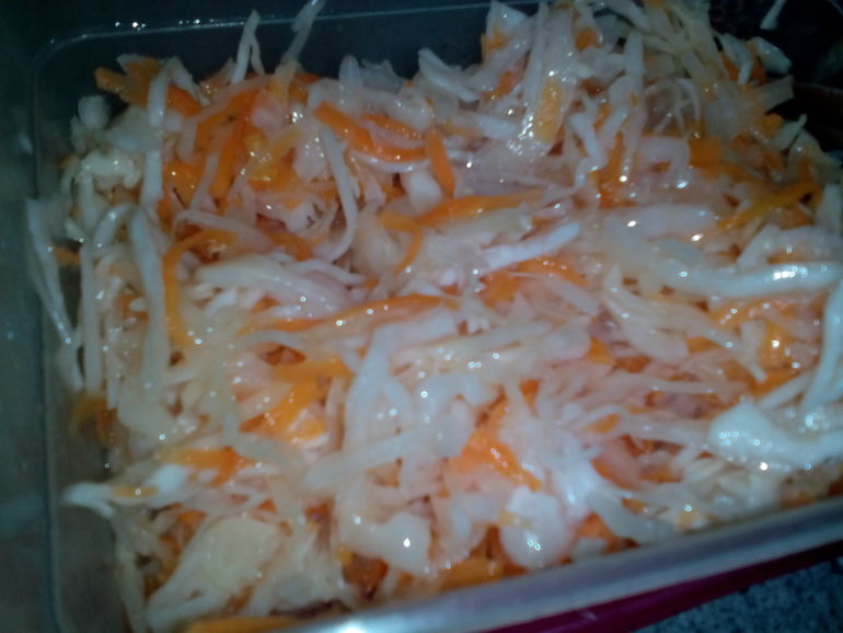 1. Всё нашинковать, морковь натереть. Уложить плотно в банку.