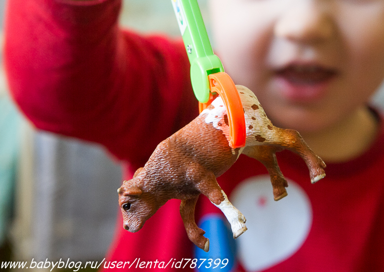 Механизм хваталки очень простой: нажимая пальчиком на рычаг в ручке, ребенок активирует хватательный элемент. Это песня! Это не пинцет, не китайские палочки и не щипцы. Это в сто раз круче, во время первых попыток овладения инструментом можно услышать, как разгоняются шестеренки в голове! Можно хватать все, что угодно, от больших и маленьких игрушек до макаронин, рисинок и гречи, последнее дается тяжело даже взрослому человеку=))))