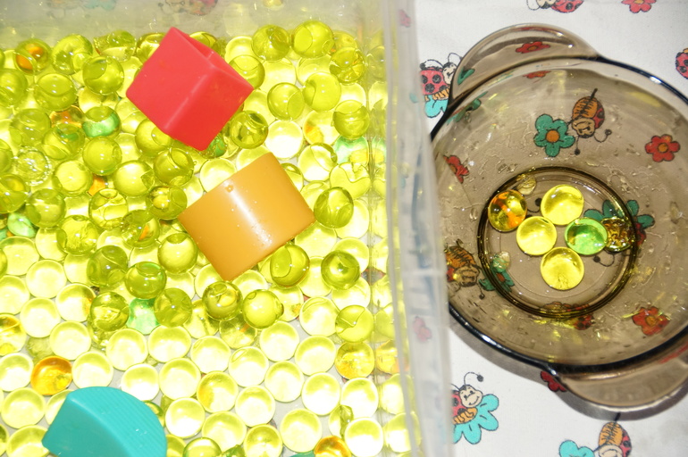 Надо сказать, что это двоякое ощущение: опускать руки в гидрогель и перекатывать его в ладонях, между пальцами. Он мягкий, прохладный, но скользкий, чем у меня вызывает ассоциации с лягушкой. Для изготовления нашей сенсорной коробки я приобрела два пакетика гидрогеля: вот такого - желтого и зеленого цвета. В итоге, у меня почему-то все шарики получились желтые. Двух пакетиков хватило, чтобы скрыть дно большого контейнера.