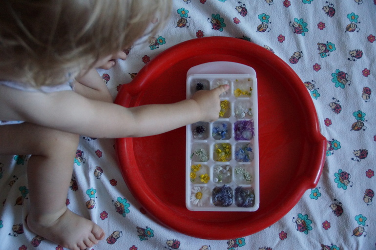 Цветы мы собрали накануне в Ясной Поляне. Заморозили парные образцы в форме для льда. И утром у нас была чудесная развивашка! Сначала рассмотрели кубики на предмет парности и цветовой гаммы.