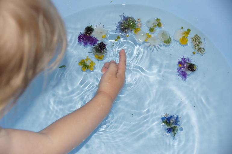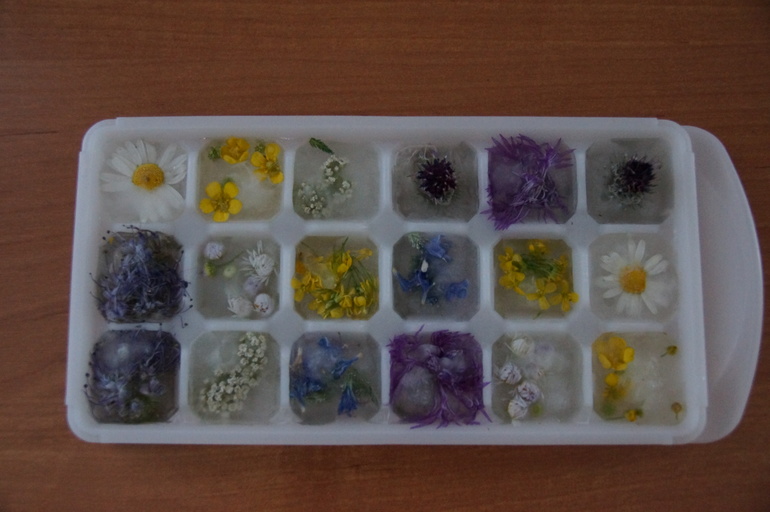 Немного яснополянского разнотравья, вода, холод, лед - и прекрасная познавательная игрушка готова. Замороженные растения помогли нам повторить цвета, антонимы: "холодный-теплый", сделать опыт про то, как лед тает в теплой воде.