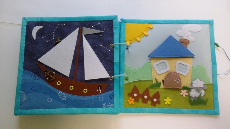 Данная книжечка направлена на развитие мелкой моторики, тактильных ощущений малыша, изучение основных геометрических фигур, цветов, понятий "большой-маленький", "день-ночь", "много-мало", с помощью данной книжки можно также осваивать счет. Книжка рассчитана на возраст от 1.5 лет. Малышу будет весело и интересно!!!!