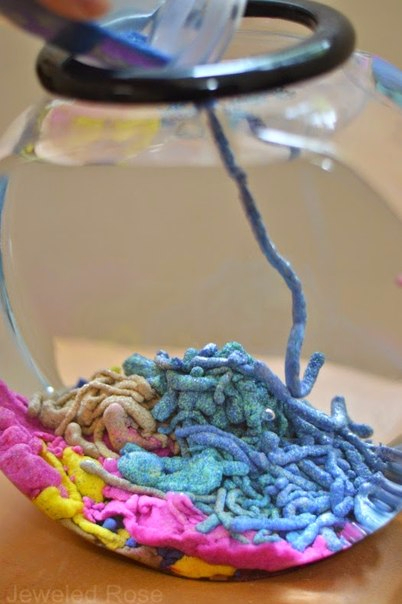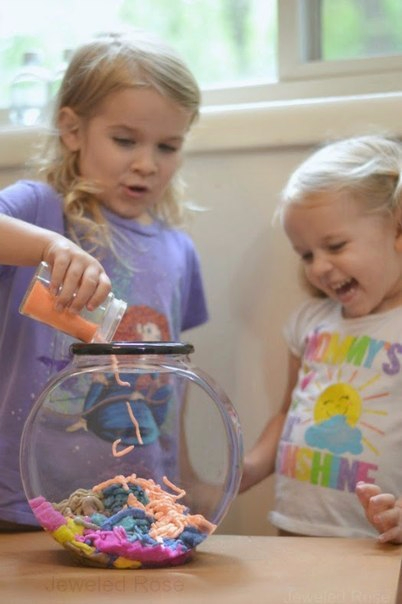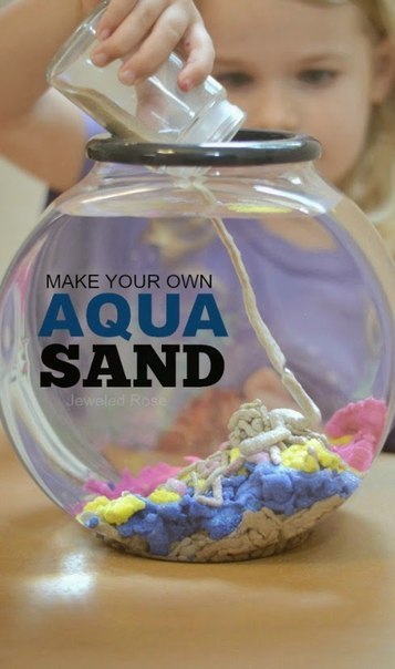 На листы бумаги нужно разложить кучки песка (обычного и цветного) и хорошенько сбрызнуть их защитным спреем, чтобы песок полностью пропитался. Теперь кучки необходимо разровнять по листам вощеной бумаги и оставить просохнуть в хорошо проветриваемом помещении, на что уйдет около часа. Волшебный водяной песок готов, остается только рассыпать его по пластиковым контейнерам и позвать детей для игры.