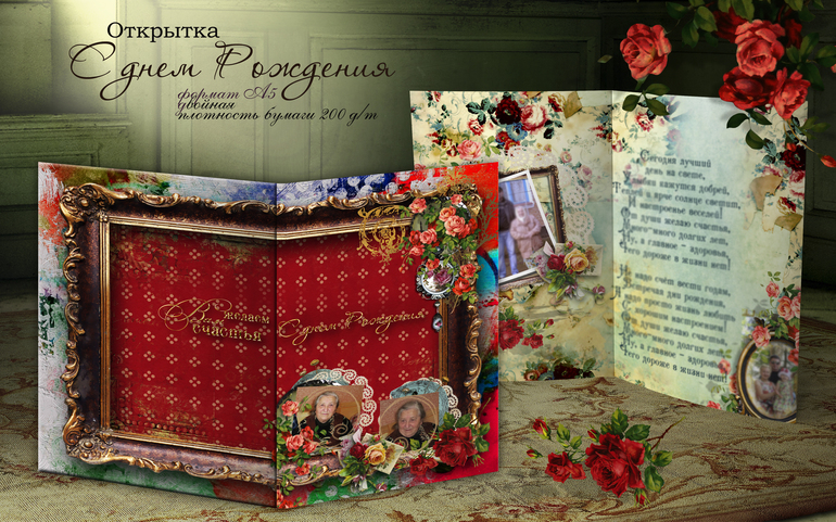 Для этой открытки вам потребуется 3-4 фотографии-ретро и 1 самая "свежая" на обложку. Внутри красивые стихи..
