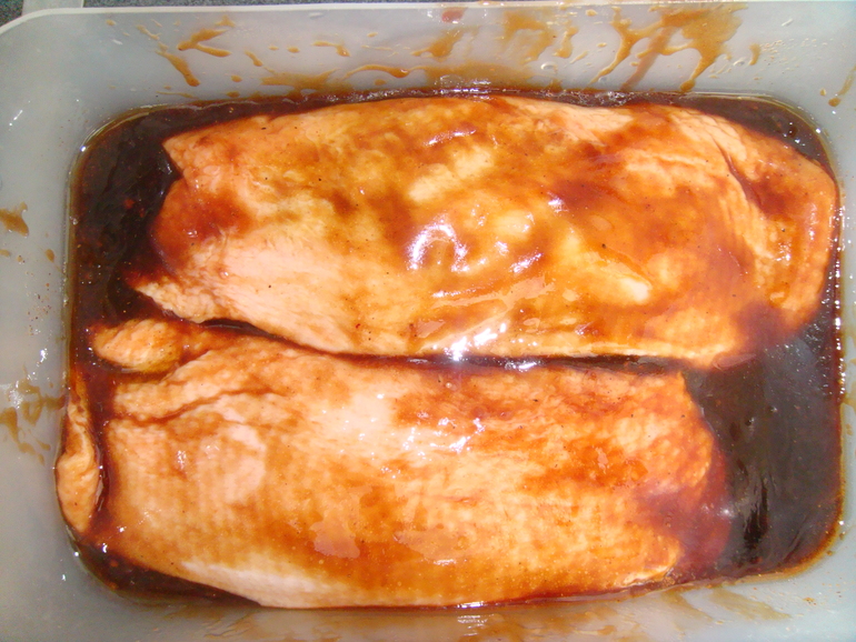 3 ст.л. соевого соуса, 2 ст.л. соуса Терияки, 1 ст.л. кунжутного масла, 1 ст.л. рисового уксуса, немного имбиря: