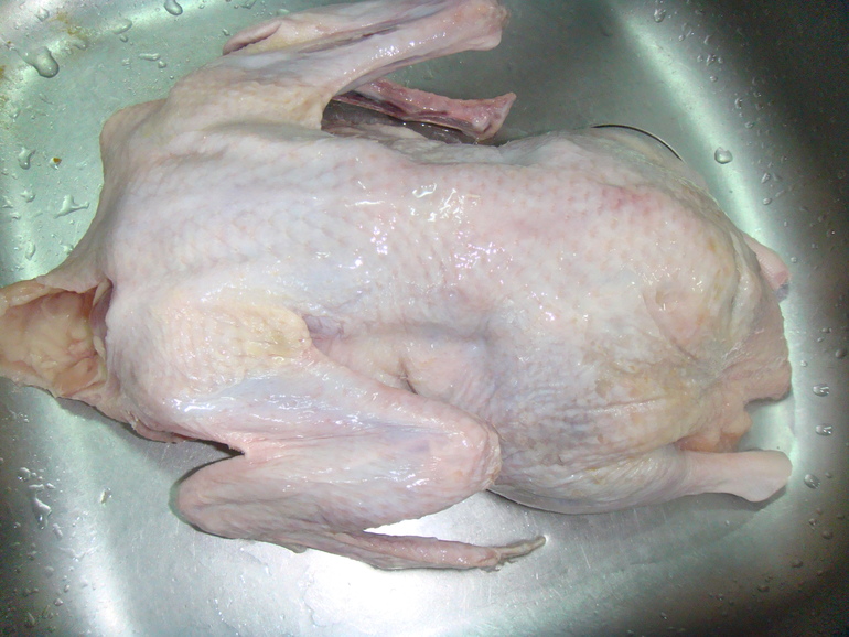 Перерезать суставы ножек и крыльев. Перевернуть птицу, сделать надрез посередине грудки:
