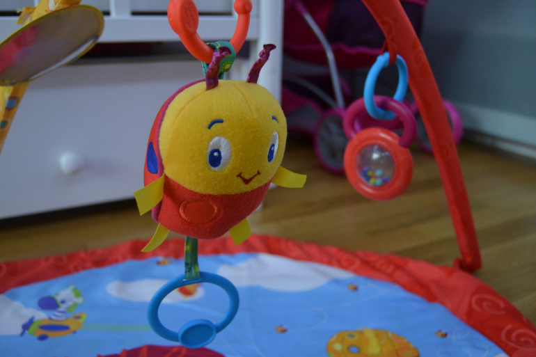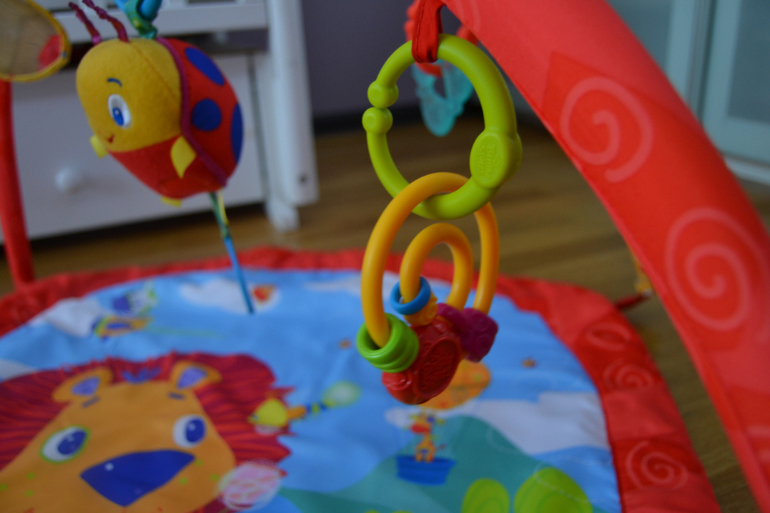 На коврике есть безопасное зеркальце и спиралька с бусинками, которая поможет развить мелкую моторику. Есть также игрушка-прорезыватель.