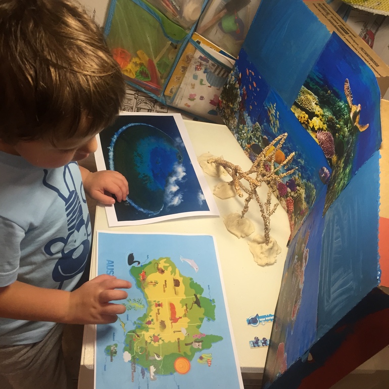 К барьерному рифу мы готовились и обсуждали кораллы, набрали веточек покрасили их и стали облеплять их пшеном.