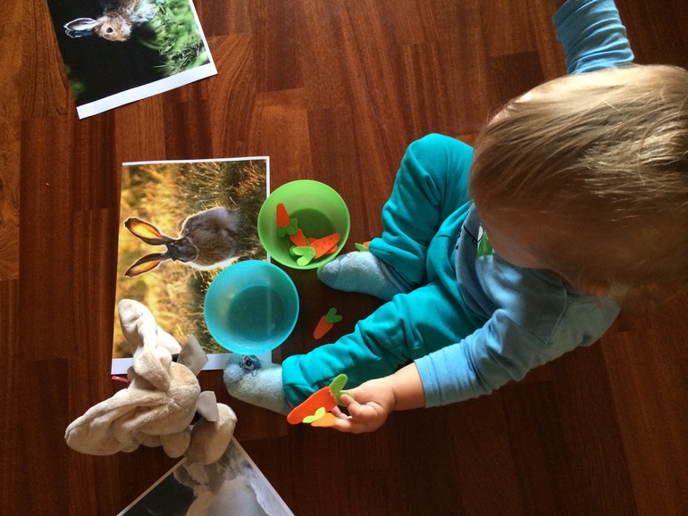 Посмотрели с Матвеем всех заек, на картинках, своих мягких. Обсудили, как прыгают, что кушают.