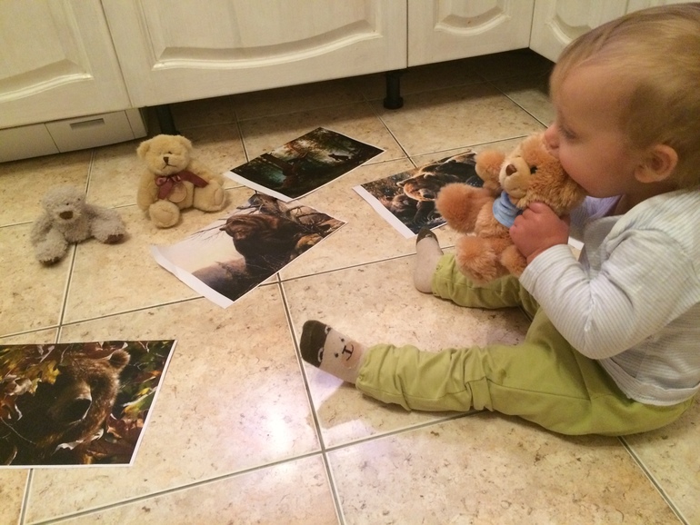 Рассматривали лапки, глазки, носик. Матвей активно здоровался с мишкой. Изображали, как он рычит.