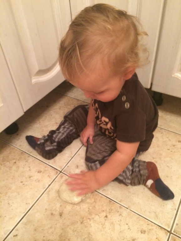 Колобок катали из настоящего теста (но не для колобка). Больше всего Матвею понравилось бить ладошкой по тесту, что бы кружок становился плоским.