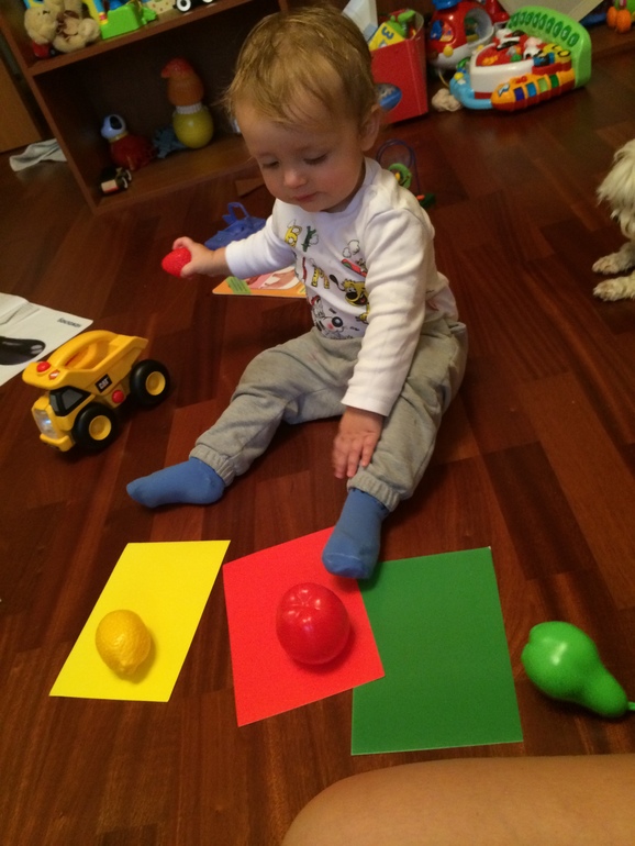 Сортировка по цвету, взяли цветной картон и овощи\фрукты такого же цвета, попытались разложить.