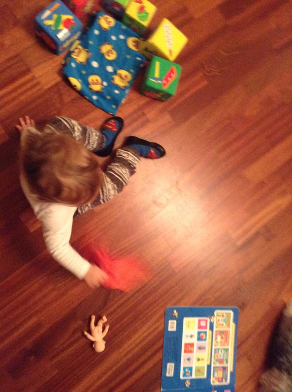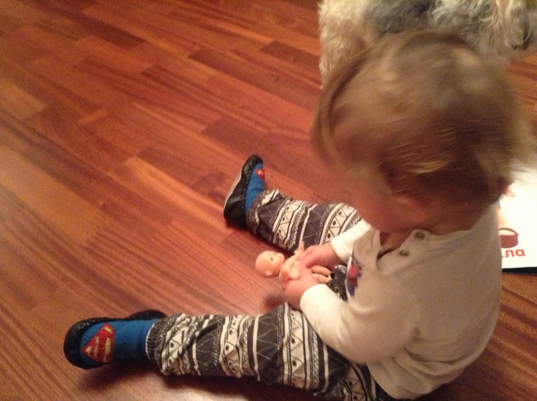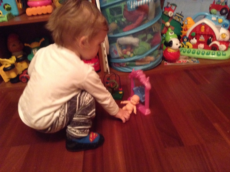 Построили маленький домик пупсику, положили одеяльце. Попробовали запеленать и спать уложить, но Матвей зверствовал, таскал его за ногу.