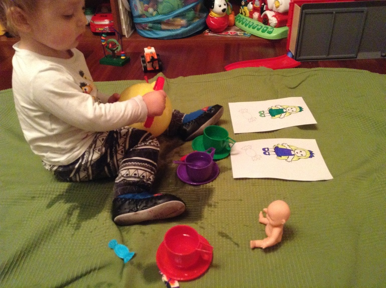 Попытка вернуться к плану и позвать кукол на чай, кукол переделала, но суть та же куклам нужно раздать конфеты и чашки под цвет платьев.