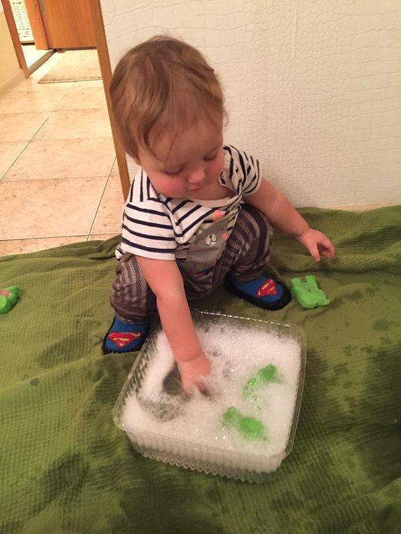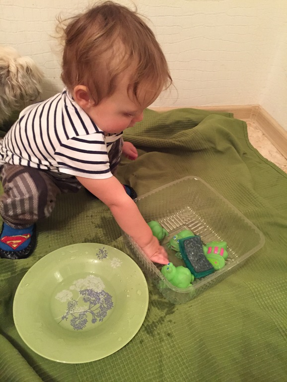 Налила в тарелку воду, лягушек посадила в другую без воды, показала, как губкой переливать воду. Матвею понравилось (однажды уже делали), правда, выжимал он ее на себя все время.