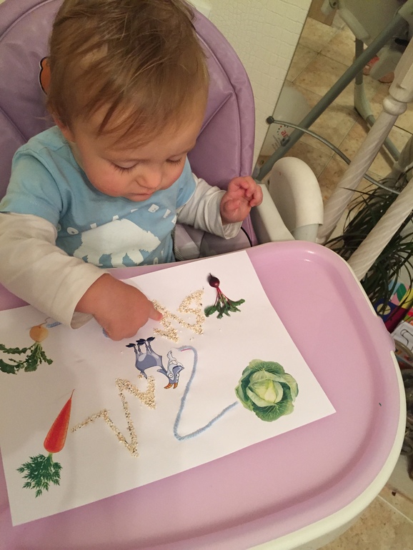 Вторым пунктом у нас была проводилка, где линии заменила на нитки шерсти и крупы, Матвей водил пальчиком, пытался отковырять.