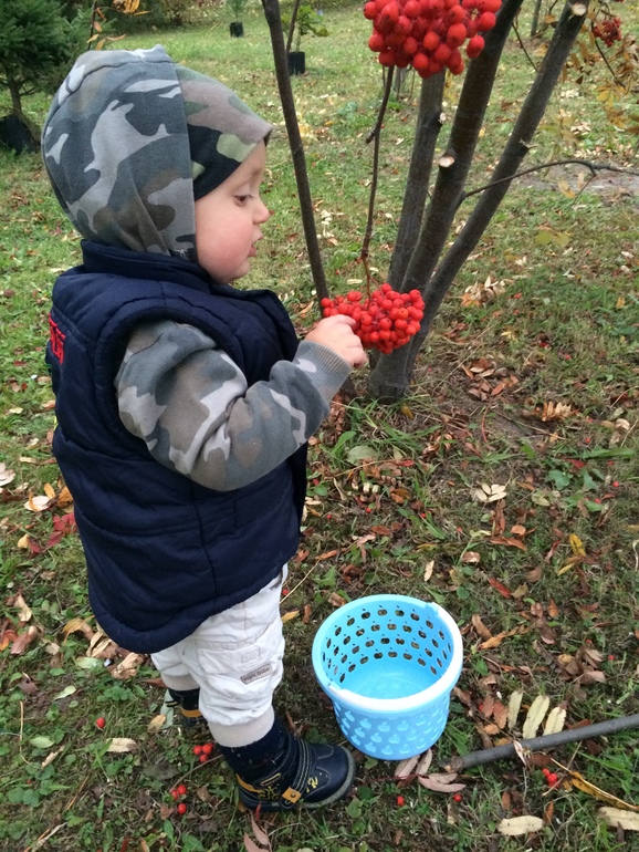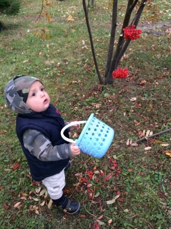 Итак, пошли гулять, за рябиной. Не особо ее много, на дереве вся. Собирали в ведерочко, Матвей кончено же выкидывал обратно.