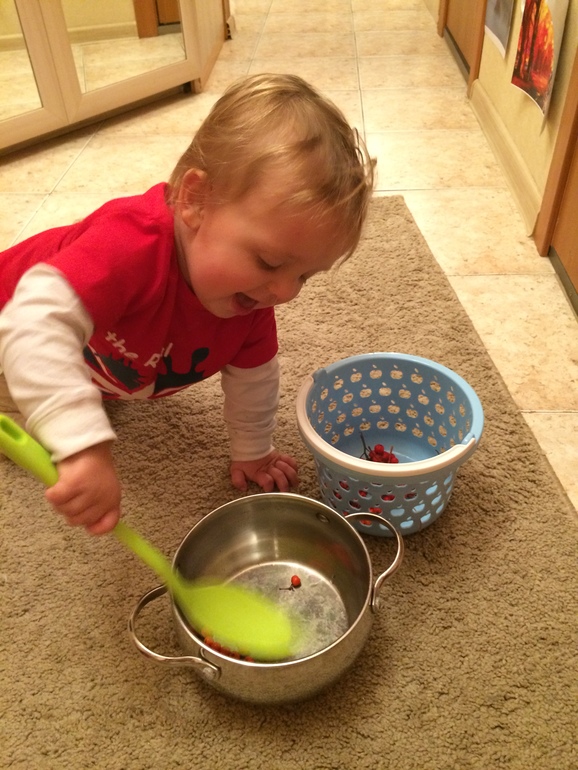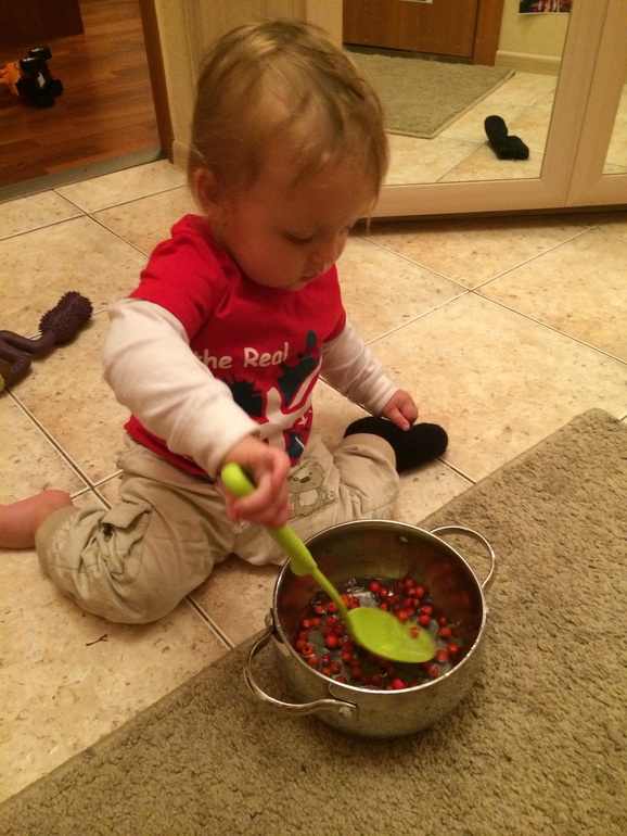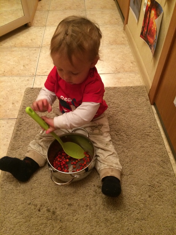 Потом я дала ему кастрюльку, ложку и мы переложили из ведерка ягодки в кастрюльку.