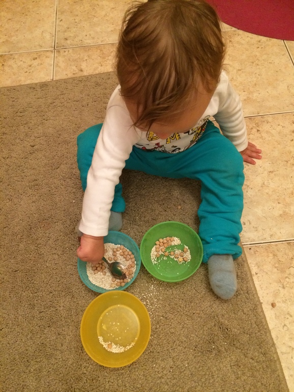 Потом мы пошли пересыпать ложкой запасы. Горох и ячку, у Матвея ПОЧТИ прекрасно получилось, старательно он очень орудовал ложной.