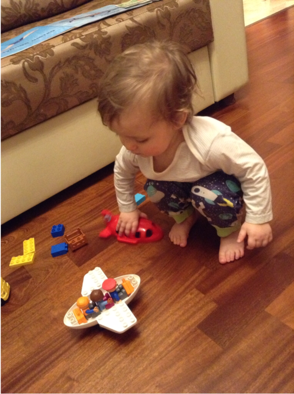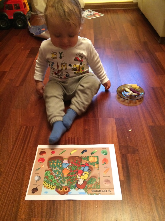 Разрезные картинки. Пытались складывать вместе, но Матвею понравилась только не разрезная картинку, другую он раскидал как обычно.