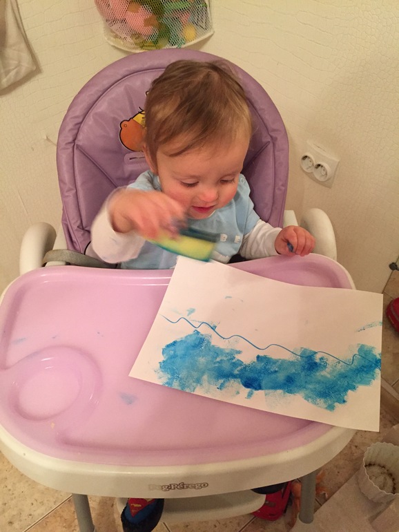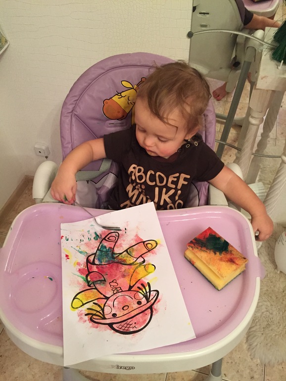 Отправились рисовать небо и траву (горизонт и пастбище). Дебют губки, прошел на ура, до вилки так и не добрались, решила оставить посохнуть.